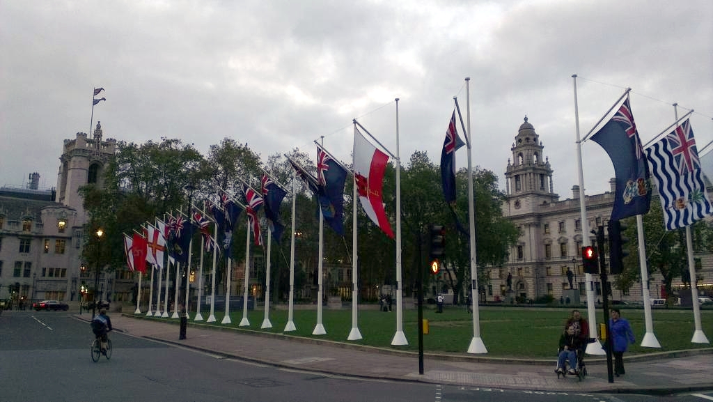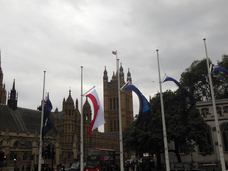 The flags of the Crown Dependencies and Overseas Territories flying in Parliament Square on the occasion of the State Visit of the President of Indonesia. This is the first time these flags have ever been flown as a coordinated group in the United Kingdom and a stirring sight they are. 21 flags were flown with the Union Flag appearing twice to represent the two Sovereign Base Areas of Cyprus and also Ascension Island whose flag is designed but has yet to achieve final approval. These flags will fly again on future State Visits. The Flag Institute believes they should fly permanently to demonstrate the full extent of the realms and territories of Britain beyond the seas.